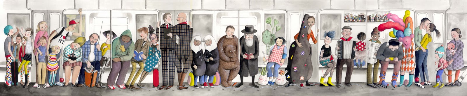 Also, this book reminds me of the subway artwork in NYC by Sophie Blackall. Her "Missed Connections" was a hit for me, and the art print was what NY is all about -differences, but the same journey.