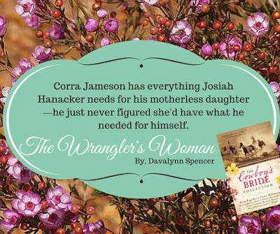 There is just something about cowboys, don't you agree? Wrangler's Woman by Davalynn Spencer is the 7th novella of The Cowboy's Bride Collection starts with a herd of cattle running through the Main Street of Ford Junction. Corra watches along on the porch of her sister's family’s boarding house when her eyes meet the eyes of our wrangler, Josiah. And then...that is how the hearts of our main characters are tied.