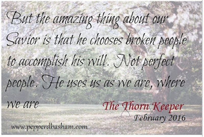 Nothing can prepare me with the level of completeness and perception Pepper wrote about Catherine in The Thorn Keeper. Her journey in Christ - her change, her compassion and selflessness developed like a well seasoned jambalaya, with all the right ingredients balanced to fully enhanced its flavors as it stewed together. Only in Christ can a person's beautiful nature be completely and utterly uncovered and exhibited. Catherine's big heart, and her passion to doing what is right in God's eyes humbled me. Like many, she carries the thorns of her past. In her mind, she thinks she's unworthy for any additional blessings the Lord has in store for her, especially a man as good as Dr. David Ross. Yet, it is through this self-denial we see how she's transform from a broken mess to something luminous and whole, just as a quilt sewn together from many pieces.