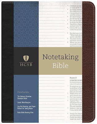 Do you take notes when you study your Bible? Do you have one Bible that is designated as your note-taking Bible - as one that you can write on it, highlight it and underline it? Well, if you do, I think you'll greatly appreciate The HCSB Note-taking Bible from Holman Bible Publishing and B&H Publishing. Now, I'm not an expert on translations, so most of this review is about what I like in terms of the physicality of this Bible. However, I will say the HCSB version is a simple and easy to understand contemporary English version. One feature of the HCSB version I do like is when it indents and create an easy to read "section" or "paragraph" of an important verse(s).First, the outside. The HCSB Note-taking Bible has a bonded leather exterior hardcover, making it sturdy and one to last for a very long time. At 8.5" x 6.5" x 1.5" thick, it's easy to carry around, but personally, I prefer it at home due to the weight (2.5 lbs) and I typically take more notes at home. What I also appreciate tremendously is the "open spine" feature. It is designed to lay flat and open no matter the page you are on, and without causing the spine to degrade in time like some glued spine books are (including Bibles). It also comes with a brown ribbon book mark to help you hold your last reading page.