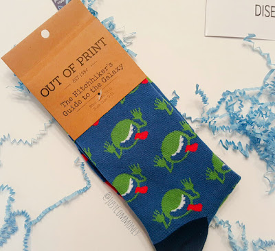First item, Out of Print "The Hitchiker's Guide to the Galaxy" socks. Subscribers either get this one or the "Do Android Dream of Electric Sheep Socks." Love socks in book boxes!! - Value: $10