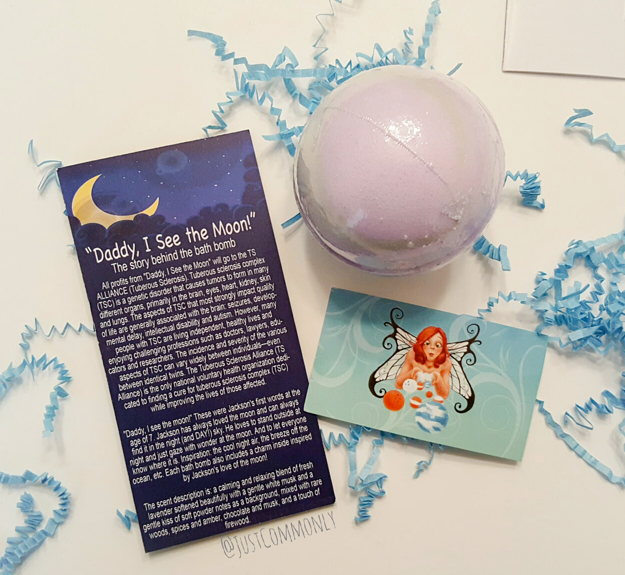 Next, we have the "Daddy, I See the Moon" bath bomb from Fizzy Fairy Apothecary. It also comes with an incredible story. This bath bomb was inspired by a special young man and all the proceeds from this item are donated to the TS Alliance to help find a cure for tuberous sclerosis. I just love purchases that goes towards a good cause. The scent is quite lovely, lavender with a gentle white musk, and some other notes in there. Smells really good! (And on a side note, this is the first bath bomb I've received that is not all glittery!! Yay!) Value: $5.50