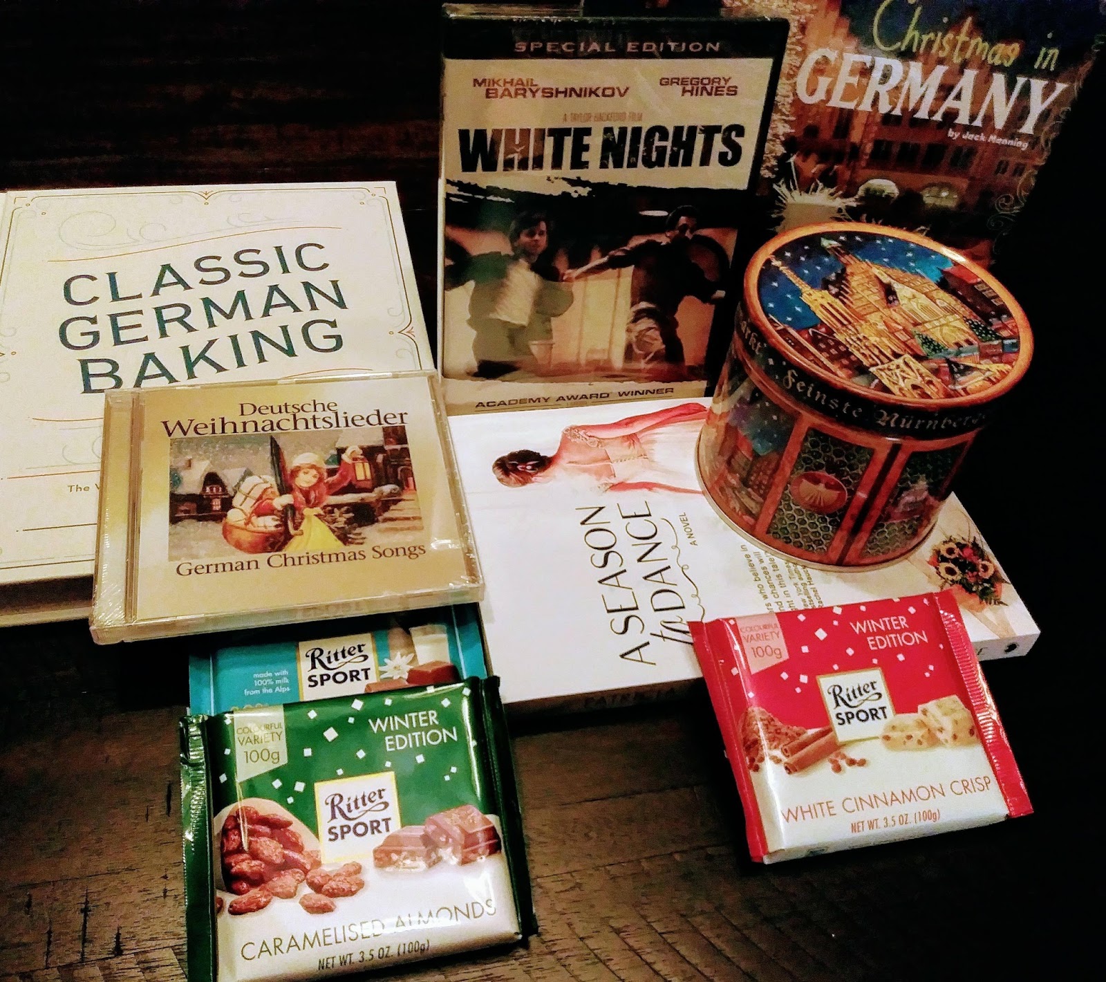 German Christmas Songs CD, Baryshnikov movie White Nights (with Helen Mirren), Classic German Baking by Luisa Weiss, A Season to Dance, German chocolates, and an ornament.